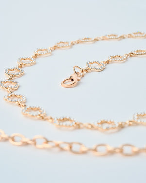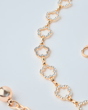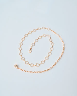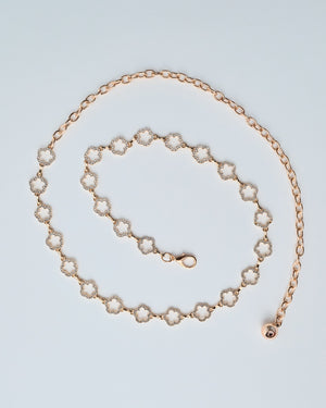 Delicate yet dazzling, this gold-tone metal belt features chic clover links that shimmer with every step. The perfect finishing touch for adding a hint of sparkle and sophistication to any outfit!