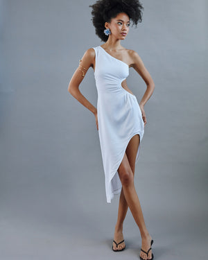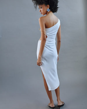 Love the spotlight? Then this one-shoulder maxi dress is just what you need! Designed with a cinched side, thigh-high slit, and satin-like fabric, this dress looks simply luxurious and sultry.