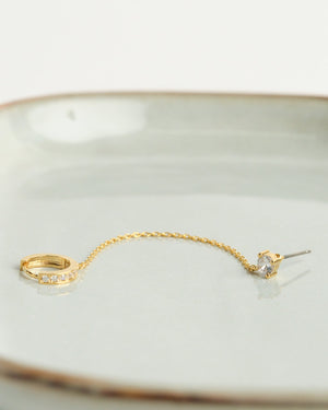 This gold tone ear cuff features a stud earring and a touch of bling. The cuff boasts beautiful zirconia accents and a classy chain link design.