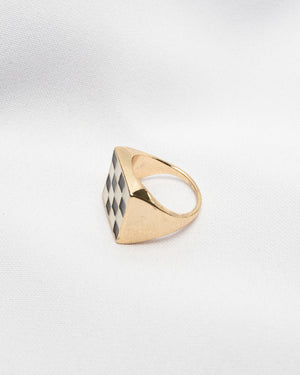 This checkered ring features a chunky, black and white design. Classic and gold tone, this adorable ring is a whole 90's vibe.