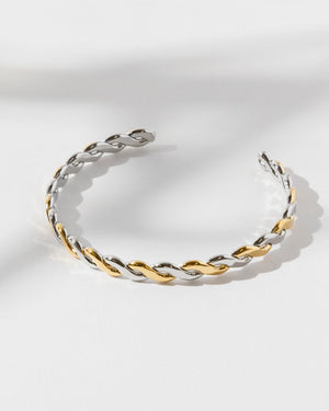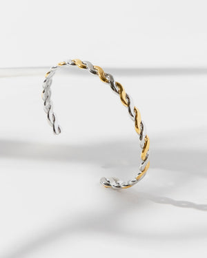 Turn heads with this 18K gold-plated stainless steel cuff, flaunting a chic twisted design kissed with two-tone plating. Sleek yet striking, it’s the kind of arm candy that works from boardroom polish to weekend glam.