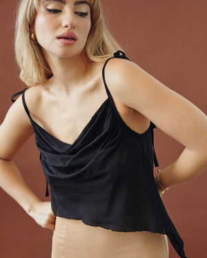 Keep it effortlessly chic with this casual top, featuring a sultry deep cowl neck and adjustable spaghetti tie straps for a perfect fit. The asymmetric hem adds a playful touch, making it your go-to for laid-back glam!