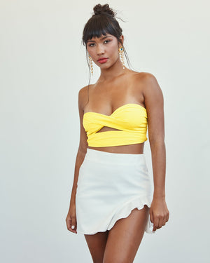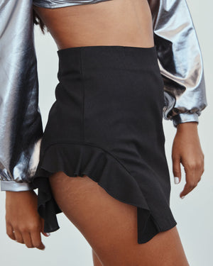 Designed with a flattering high waist, this skirt accentuates your curves and creates a streamlined silhouette. The playful ruffle detail on the left side adds movement and a touch of flair, making it stand out from a classic mini skirt.