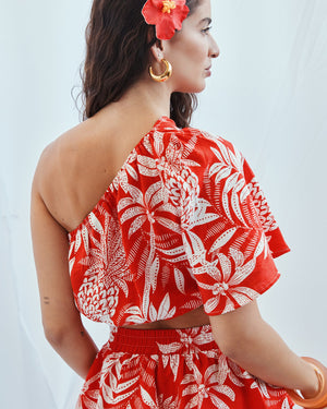 Take your style up a notch with this one-shoulder crop top, complete with a dreamy butterfly sleeve for a touch of flair. The elastic band waist adds comfort and shape, making it the perfect mix of effortless and eye-catching.