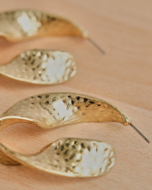 These artisan style hoops feature a funky, wave design. Gold tone, and medium in size, these hoops are certain to make a statement.