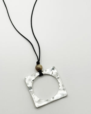 Add a touch of artsy flair with this cotton thread necklace, featuring a hammered square pendant with a bold ring cutout. Finished with a slide clasp, it’s the perfect mix of effortless cool and statement style.