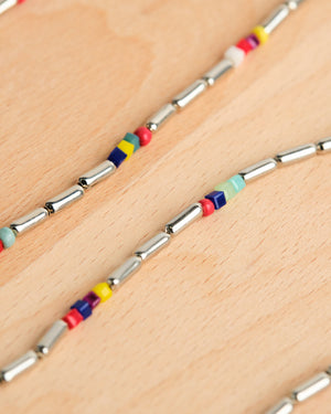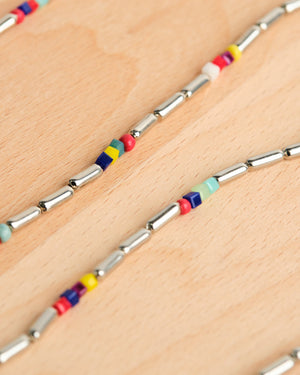 This single strand necklace features a gold tone, adjustable design. With bold and vibrant colors throughout, this layerable masterpiece is certain to make a statement.