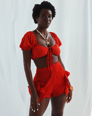 A chic and feminine addition to your wardrobe. Designed with a flattering high-rise fit, they cinch at the waist to enhance your silhouette. The playful ruffle accents on the sides add a touch of charm and movement, elevating the classic short style.