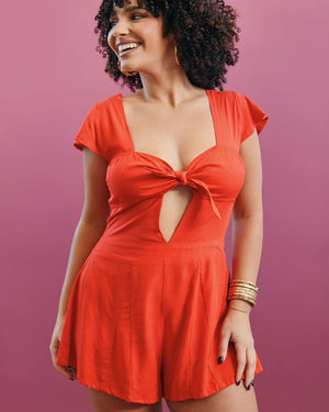 This sexy one-piece jumpsuit brings all the charm with its flirty front tie and stylish cutout that instantly elevates your look. Finished with breezy sleeves and a comfy smocked back, it’s the effortless outfit you’ll reach for when you want to feel cute and confident.