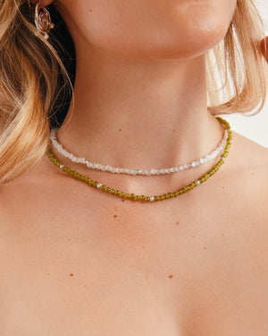 Add a pop of earthy color to your layering game. This dainty crystal necklace features earthy-toned beads with subtle silver accents, giving your neckline a natural sparkle with just the right amount of shine.