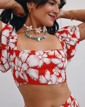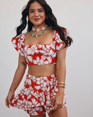 A little sweet, a little bold—made to bring the sunshine. This flirty top features a square neckline and flutter sleeves, balanced with a smocked back for stretch and ease. The cropped length pairs perfectly with high-waisted shorts or skirts, making it your go-to for beach days, brunches, and everything in between.