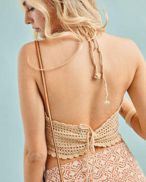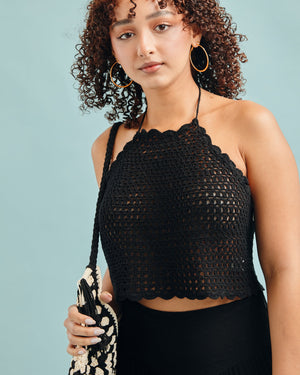 Turn up the heat with this sexy crochet top, featuring a flirty open-knit texture and a scalloped finish that hugs just right. Tied at the neck and back for an adjustable fit, it’s the ultimate statement piece for sun-soaked days and golden-hour nights.