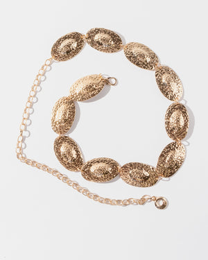 Turn heads with this statement chain belt, featuring bold hammered-metal ovals that catch the light with every step. Chic, edgy, and endlessly versatile, it’s the perfect piece to cinch your style with a touch of glam.