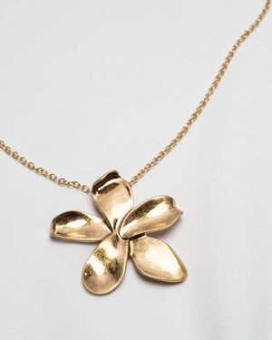Make a bold statement with the Sammy Necklace, a standout piece featuring an oversized floral pendant with sculpted petal detailing. Suspended from a long gold-tone chain, this necklace adds instant drama and elegance to any outfit. Whether worn with a strapless top or layered over a high neckline, it's a show-stopper that brings organic beauty with a modern twist. The floral design has a hand-molded look, giving it an artisanal feel that's both refined and earthy.