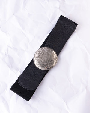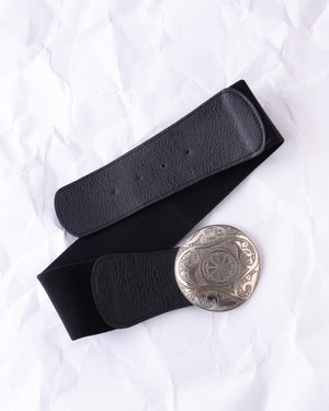 Make a bold waist-cinching statement with this wide belt, featuring a striking vintage-inspired medallion buckle that instantly elevates any look. Perfect for layering over dresses or knits, it’s the kind of accessory that turns a simple outfit into a moment.