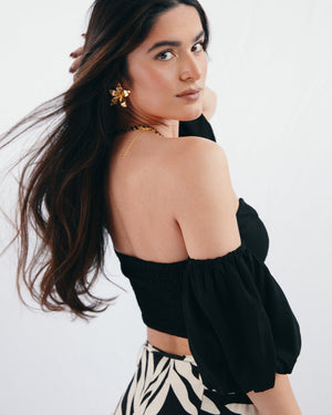 Flirty, flowy, and oh-so-fabulous — this off-shoulder crop top brings instant sunshine to your look! With its puff sleeves and snug fit, it’s your go-to piece for brunches, beach days, and everything in between.