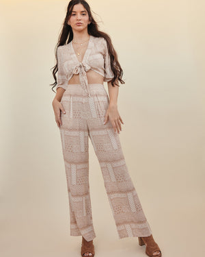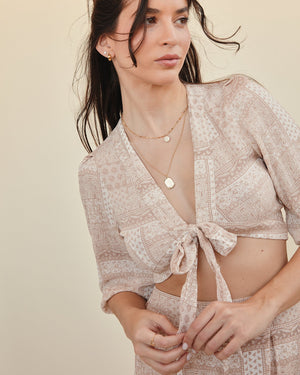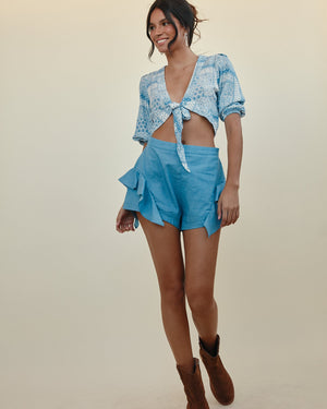Bring the drama with this stunning crop top featuring a plunging deep V-neck and a chic front tie knot. The balloon sleeves with elasticated cuffs add a playful flair, making it the perfect piece to level up your style game!