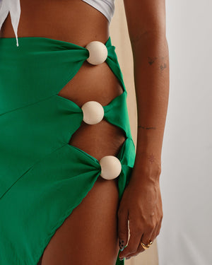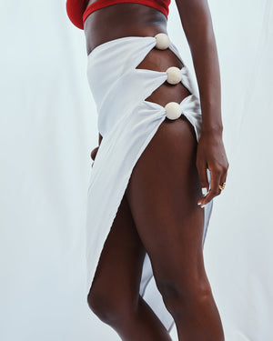 Commanding attention with sculptural detail and bold asymmetry, this statement skirt redefines sensual summer dressing. Designed in vivid hues, it features a high-waisted silhouette that wraps diagonally across the body. The cascading hem is punctuated by oversized wooden beads, which gather and secure the fabric along a dramatic hip-high slit. With its striking silhouette and playful reveal, this piece offers a daring, sculptural take on beach-to-dinner style.