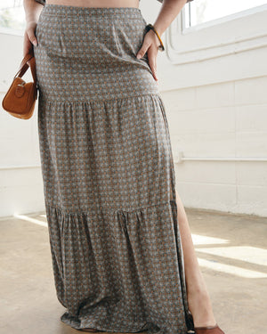 This stunning, printed maxi features a high slit design. With a bold color palette, high waisted design and gorgeous pattern, this is a head turner.