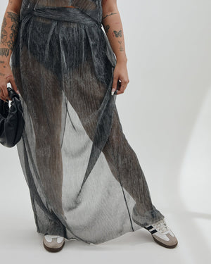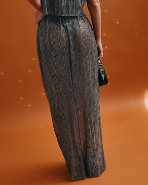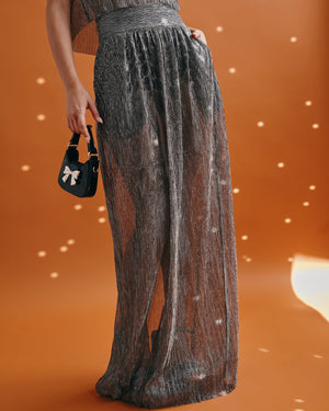 A dazzling maxi skirt where delicate pleats and metallic yarn threading create a mesmerizing shimmer with every step. The wide waistband cinches you in just right, making this skirt your go-to for effortless glam.