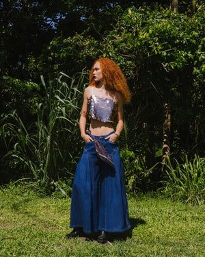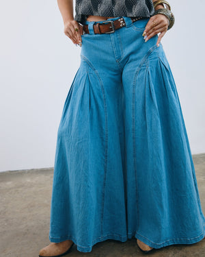 Make a bold statement in these ultra-flared denim pants featuring structured pleats and a high-rise fit that flatters every curve. Retro meets runway in this effortlessly cool pair made for twirls, struts, and all things fabulous.