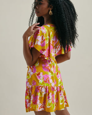 Frilly, floral and flirty. These all make for the perfect ruffled dress, accented with a beautiful floral design. The deep v-neck is accentuating and the A-line wait hugs you in all the right places. This mini is a must have!