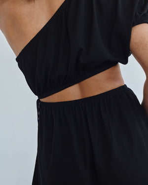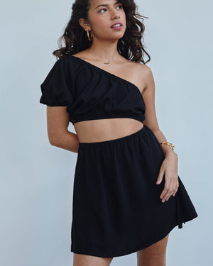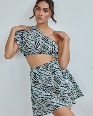 This aztec-inspired print dress features a fun zig zag appeal in classic black and white. With a one sleeve approach and a cutout at the center, this flirty dress is a great go to.