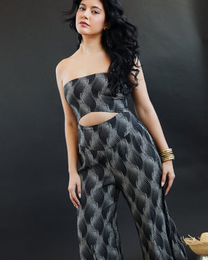 Slip into this sleek one-piece jumpsuit that pairs a strapless cut-out bodice with dramatic flared legs for instant, head-turning flair. It’s the effortless, dance-ready outfit that makes every move look like a moment.