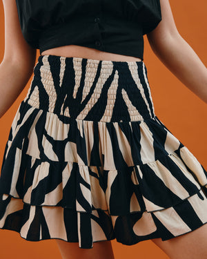 Bring the fun with this flirty mini skirt featuring a bold abstract print, a smocked waist, and tiered ruffles that move with you. Perfect for dancing, brunching, or just turning heads wherever you go!