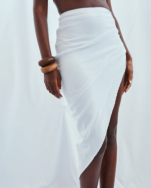 Commanding attention with sculptural detail and bold asymmetry, this statement skirt redefines sensual summer dressing. Designed in vivid hues, it features a high-waisted silhouette that wraps diagonally across the body. The cascading hem is punctuated by oversized wooden beads, which gather and secure the fabric along a dramatic hip-high slit. With its striking silhouette and playful reveal, this piece offers a daring, sculptural take on beach-to-dinner style.