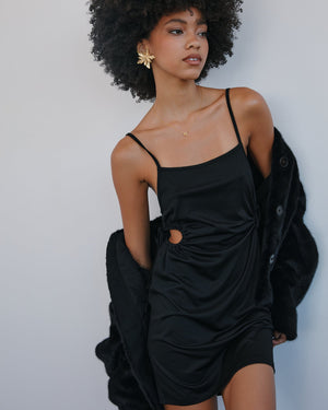 This mini dress brings all the retro energy with its trippy swirl print and side ruched cutouts that hug your curves just right. Its body-skimming fit and adjustable straps make it a total scene-stealer for nights out or beachy weekends. Pair it with simple hoops and strappy sandals to let the pattern do all the talking.