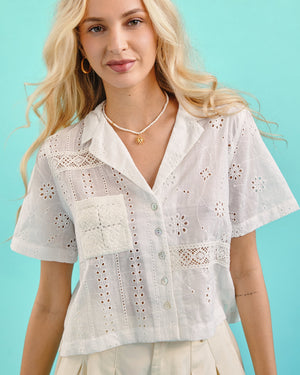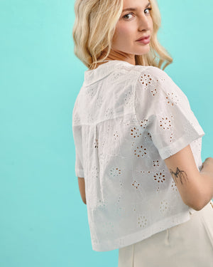 Easy, breezy, and effortlessly cool, this boxy shirt brings a relaxed silhouette with a touch of structure. Featuring a crisp collar, button-down front, and delicate eyelet design all over, it strikes the perfect balance between laid-back and polished. A throw-on-and-go staple that makes everyday dressing feel instantly elevated.