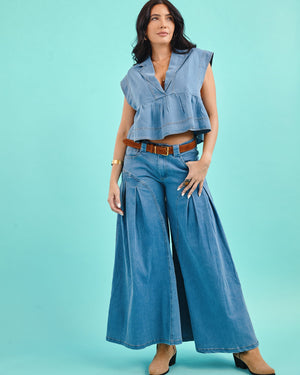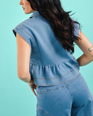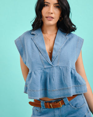 Tailored meets playful in this sleeveless top, featuring a sharp lapel neckline paired with a soft, flared hem. The structured upper gives it a polished feel, while the ruffled detail adds a fun, feminine twist. An easy statement piece that instantly elevates your everyday styling.