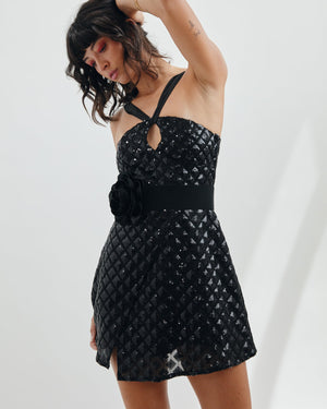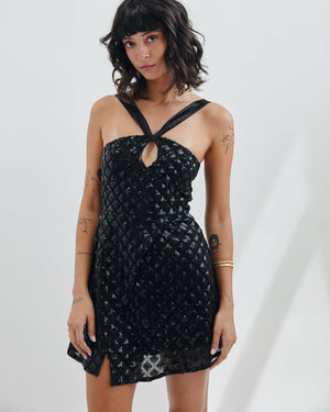 This incredible crisscross halter dress features a mini length and a side slit. Featuring a gorgeous keyhole in the center and donning a touch of shimmer, this dress is an easy instant outfit.