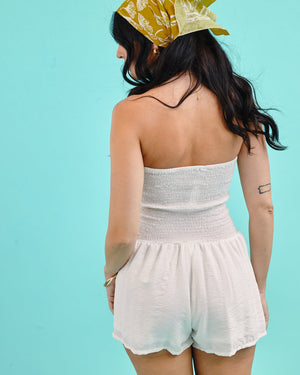 Chic with a playful twist, this strapless-style jumpsuit features a sculpted bodice with a front twist detail and a subtle cut-out for added edge. The fitted waist flows into a flared, skirt-like silhouette that gives it a soft, feminine feel. Sleek, flattering, and effortlessly cool, it’s a standout piece with modern charm.