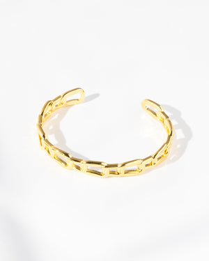 Sleek, sculptural, and undeniably chic — this 18K gold-plated brass bangle brings instant shine to any look. Its open-link design is bold yet refined, making it the perfect statement piece for every wrist stack.