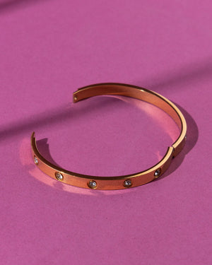 This 18K gold-plated bangle brings instant glam with its sleek silhouette and perfectly placed rhinestones that sparkle from every angle. Wear it solo for chic minimalism or stack it up when you’re ready to shine a little louder!