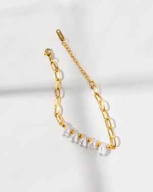 Modern shine meets timeless elegance with this 18K gold-plated stainless steel bracelet that combines chain links with lustrous freshwater pearls. Effortlessly chic, it’s the kind of piece that elevates everything from jeans to your favorite evening dress.
