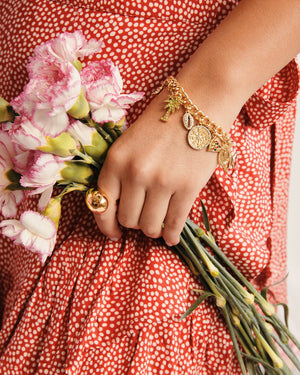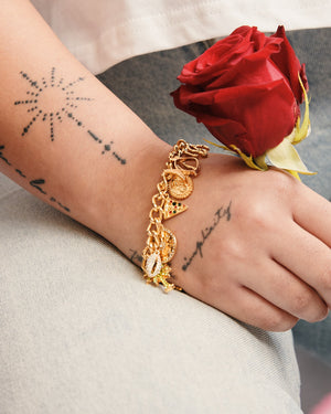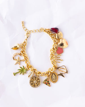 This mixed charms necklace brings playful storytelling to life with an eclectic lineup of hearts, shells, coins and symbols, all finished in radiant 16K gold plating. Style it with a plunging neck top to make this statement piece stand out!