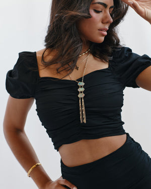 Make a layered statement in one go. This necklace stacks three distinct chains into one standout piece: a delicate cross charm, a textured golden link, and a long iridescent pendant that draws the eye. Set in warm 16K gold plating, it brings shimmer, structure, and a little bit of edge—all perfectly styled, no effort needed.