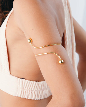 Add a dash of drama with this 16K gold-plated armband, where sleek curves meet golden orbs in a dance of shine. It’s bold, bendy, and guaranteed to make your arm the life of the party!