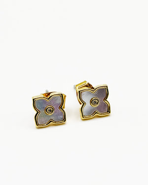 These sweet stud earrings bloom with a four-petal flower design, each petal adorned with a luminous shell. A sparkling zirconia twinkles at the center, making them little blossoms of everyday elegance.