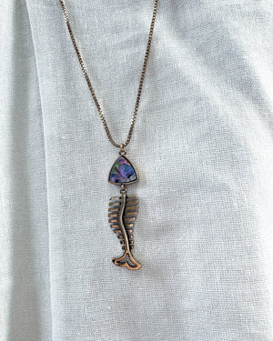 Add a splash of personality to your jewelry game. Featuring a unique fishbone pendant accented with a mesmerizing iridescent stone, this piece is the perfect mix of quirky charm and artisan elegance.  Whether you're a sea soul or just love something offbeat, this one's got your name written all over it.