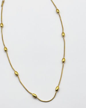 This small chain necklace features a dainty design with mirror-finish oval beads glistening along a fine chain. Subtle yet striking, it’s the perfect everyday piece to add a hint of shine to any look.