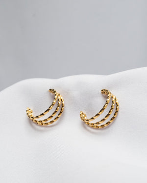 Bold yet refined, your new go-to statement hoops. Featuring a triple-band twisted design, they deliver dimension and texture in one sleek, lightweight style. Perfect for day-to-night transitions or elevating a casual outfit.
