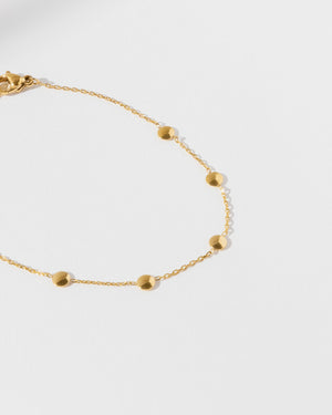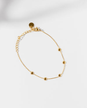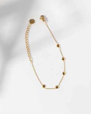 Delicate yet striking, this 18K gold plated chain bracelet is dotted with flat beads that catch the light just right. Perfect for stacking or wearing solo, it’s the effortless touch of shimmer your wrist has been waiting for.