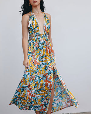 Make an entrance (and a few jaws drop) in this sultry maxi dress with a plunging front, open back, and tassel-tied halter that brings the boho glam. The flowy silhouette, thigh-high slit, and cinched waist make it equal parts goddess and getaway-ready.