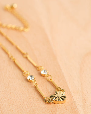 This lucky bracelet features a gold tone design with a beveled heart pendant at the center. Adjustable and dainty, this beauty is sure to make a statement.