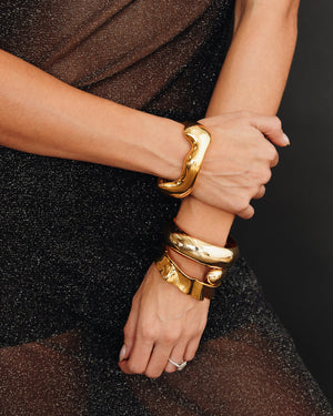 This sculptural cuff bracelet curves like liquid metal — bold, smooth, and absolutely impossible to ignore. It’s the kind of piece that instantly turns a simple outfit into a moment.
