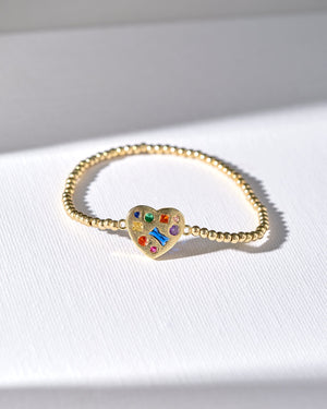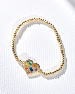 This gorgeous gold tone bracelet features a beaded, stretchy appeal with a lovely heart at the center. Crystal adorned and accented with a pop of color, this sweet and dainty beauty is great for any occasion.